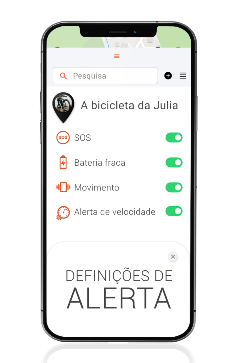 | Alarmes | Bateria fraca, Cerca virtual, Velocidade, vibração |